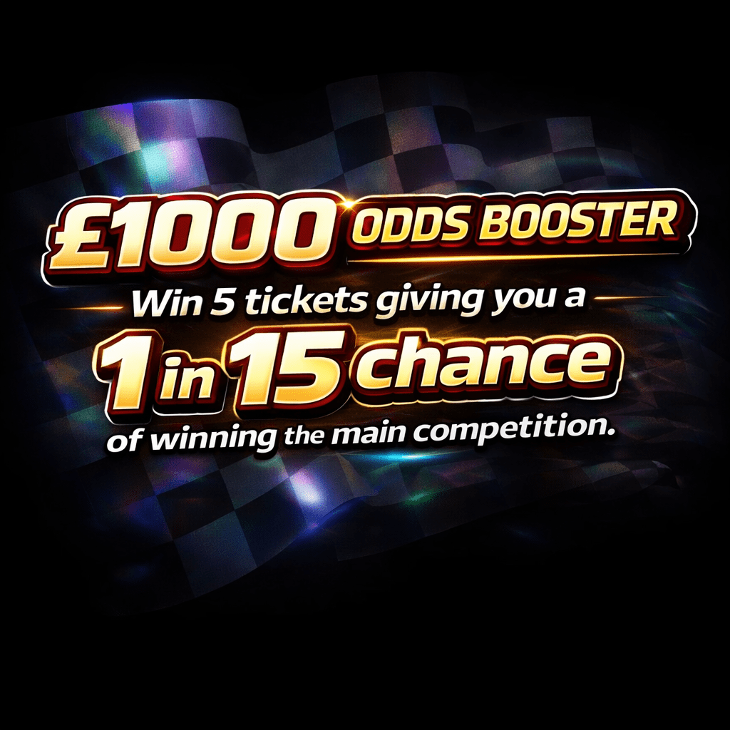 Win 5 tickets into the super low odds £1000 competition Giving you a 1 in 15 chance of winning the £1000 prize