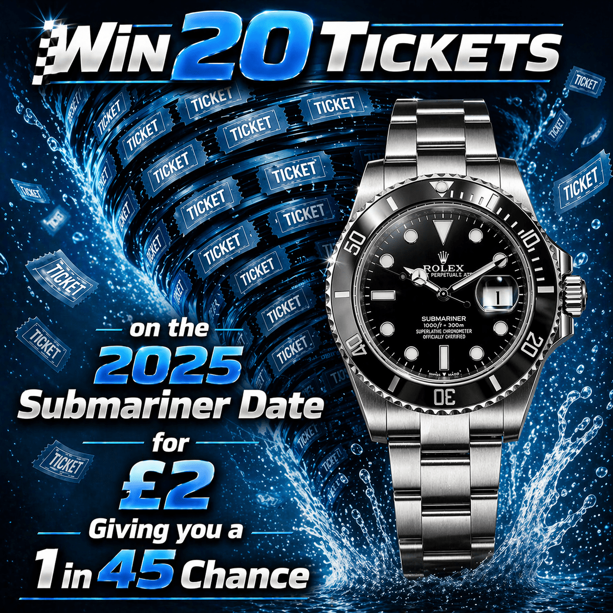 Win 20 tickets on the 2025 Submariner Date for £2 giving you a 1 in 45 chance