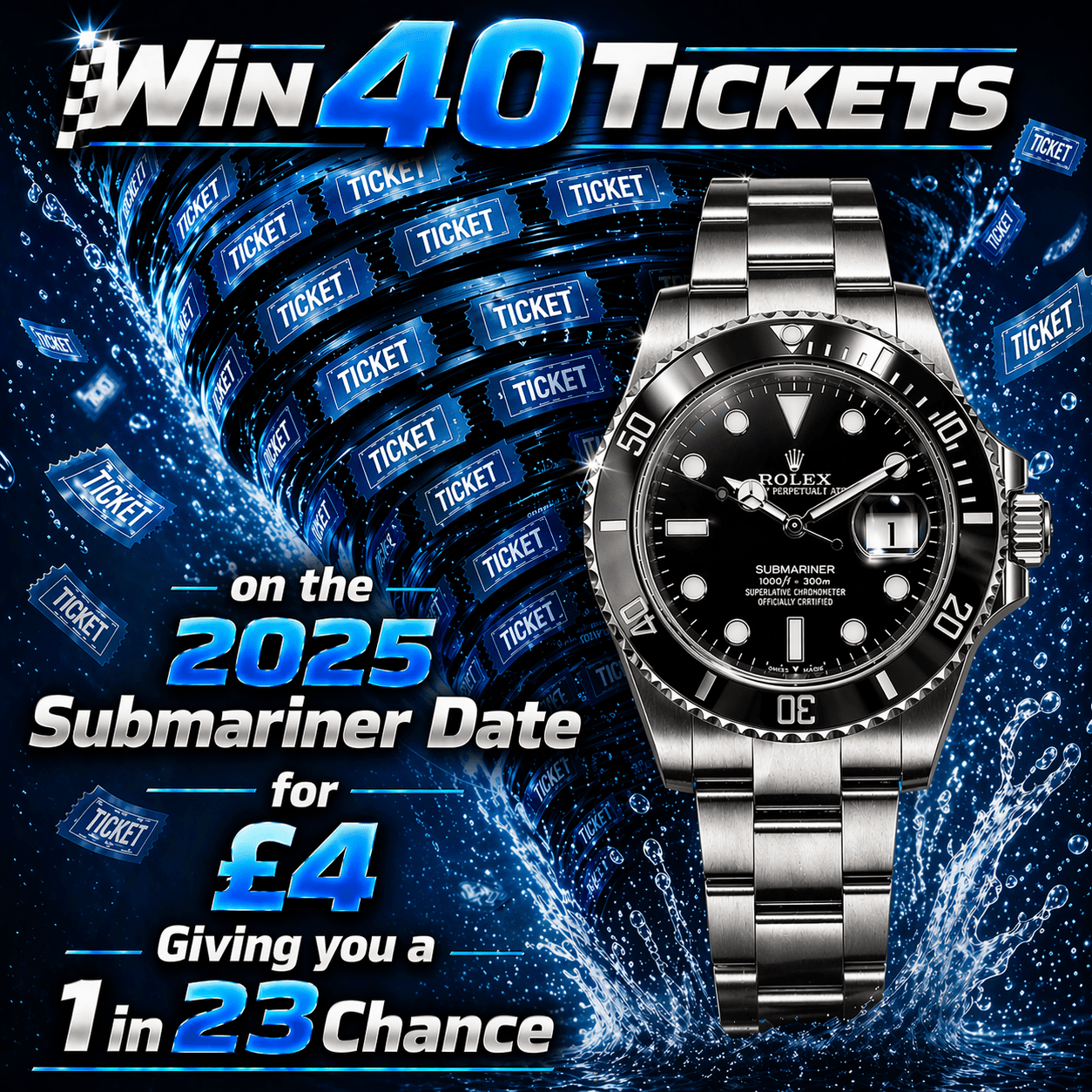 Win 40 tickets on the 2025 Submariner Date for £4 giving you a 1 in 23 chance